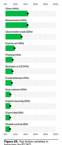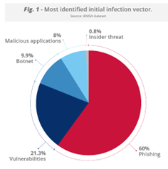 ENISA attributes 60% of intrusion vectors to phishing, while Verizon highlights ransomware (44%), stolen credentials (32%), and vulnerability exploitation (18%) as the primary initial attack vectors.
