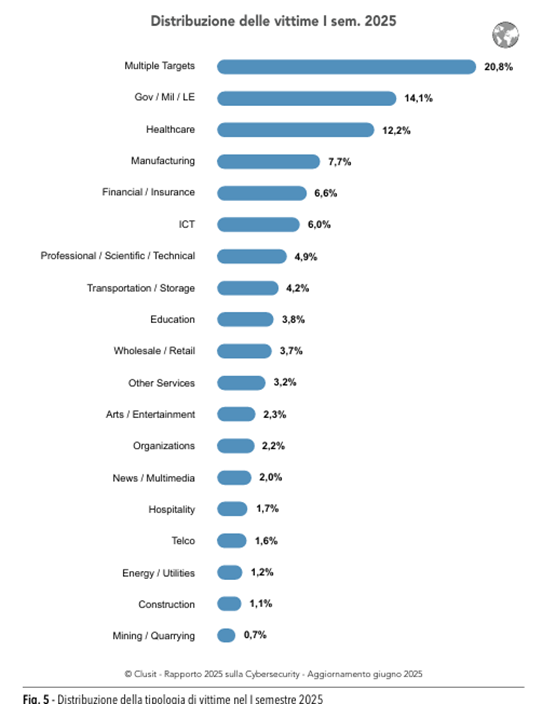 CLUSIT records a sharp rise in multi-target attacks (20.8%), followed by Government, Military, and Law Enforcement (14.1%), Healthcare (12.2%), Manufacturing (7.7%), and Finance (6%).